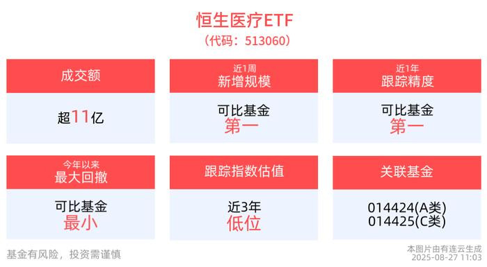跟踪精度方面,截至2025年8月26日,恒生医疗ETF近1年跟踪误差为0.060%,在可比基金中跟踪精度最高。