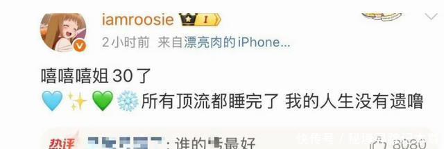 以至于这姐傲娇表示“30岁睡完所有顶流,人生没有遗憾”。 作为吃瓜群众的网友,只想感叹一句:贵圈真乱。