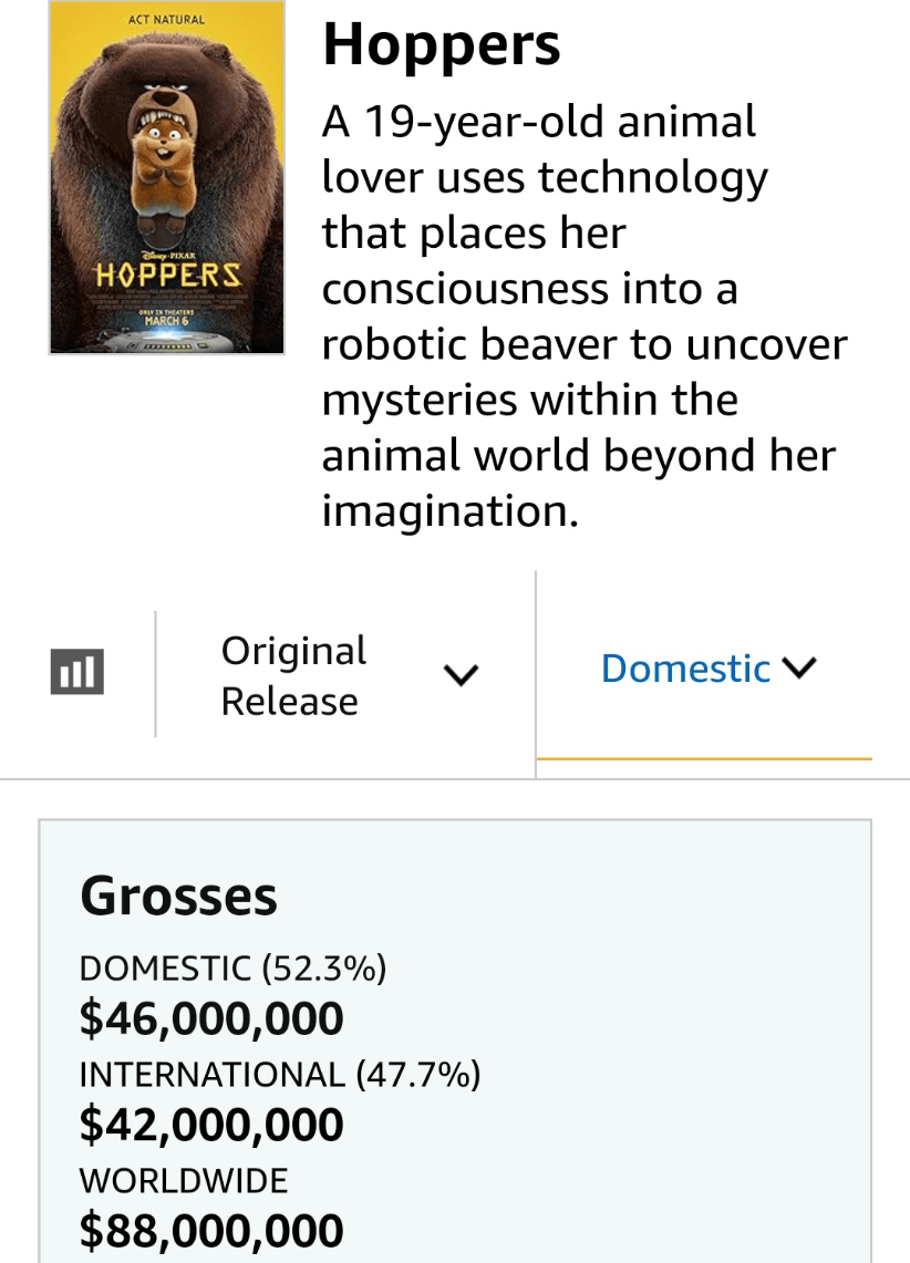 迪士尼发行,皮克斯制作的原创科幻喜剧动画电影《河狸变身计划》上周在全球41个市场同步开画,首周末三天北美票房4600万美元,海外票房4200万美元,全球票房8800万美元,成为全球周末票房冠军。