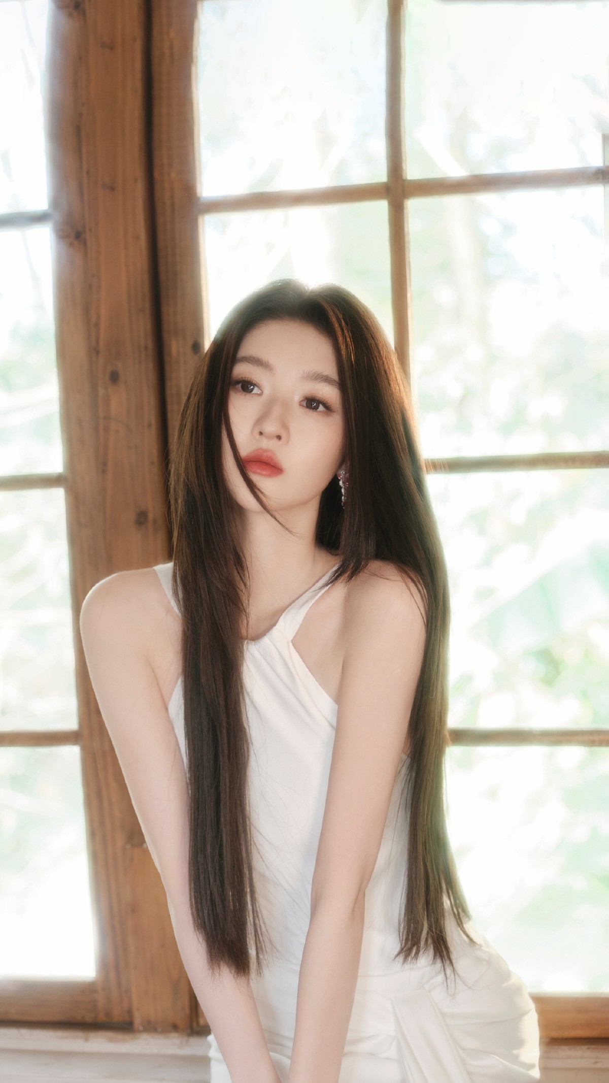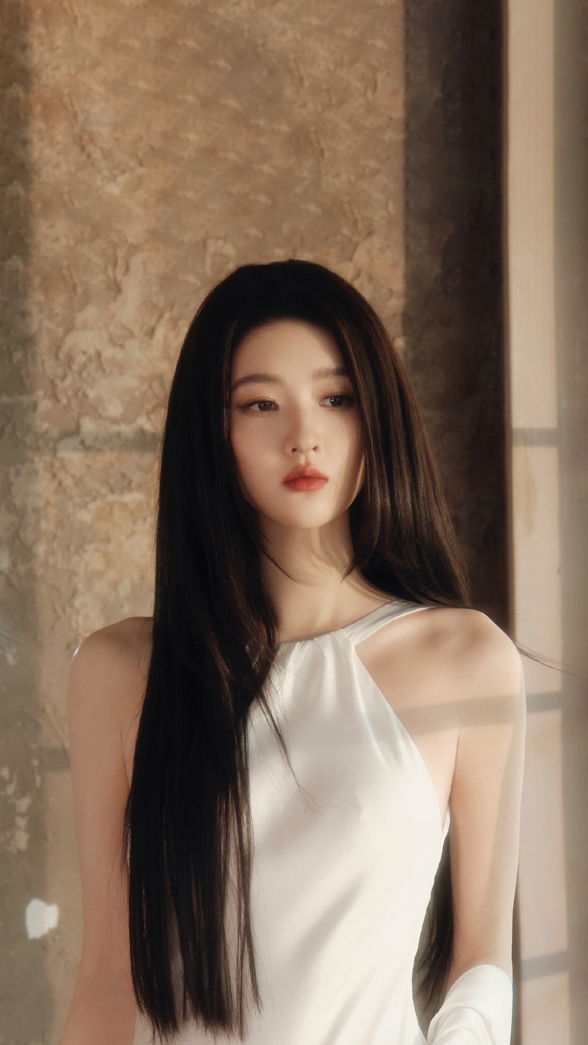 她的黑发如瀑,自然垂落,没做任何刻意造型,反而透出一种“我刚睡醒但依然很美”的松弛感。这种慵懒不是邋遢,而是一种经过审美训练后的自信:我知道自己好看,所以不用用力过猛。